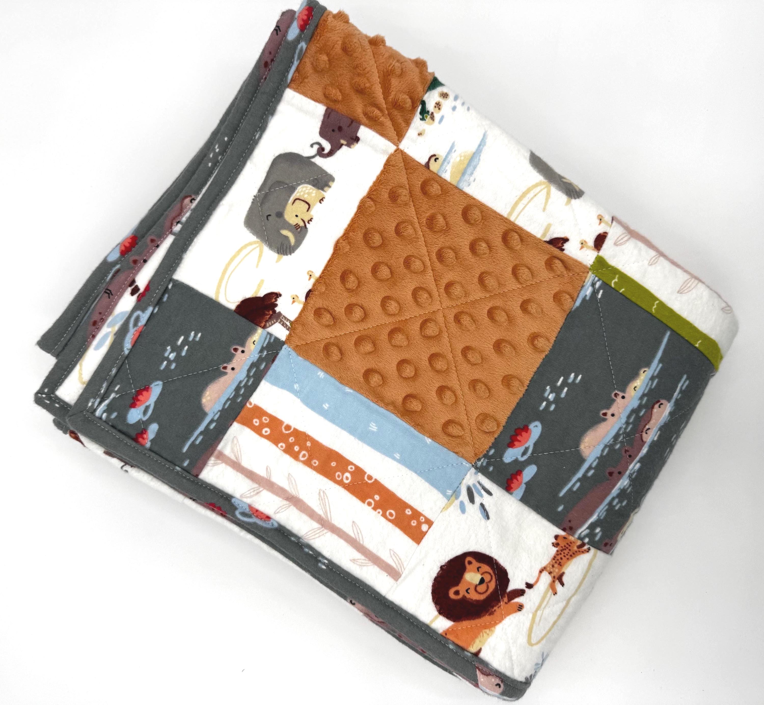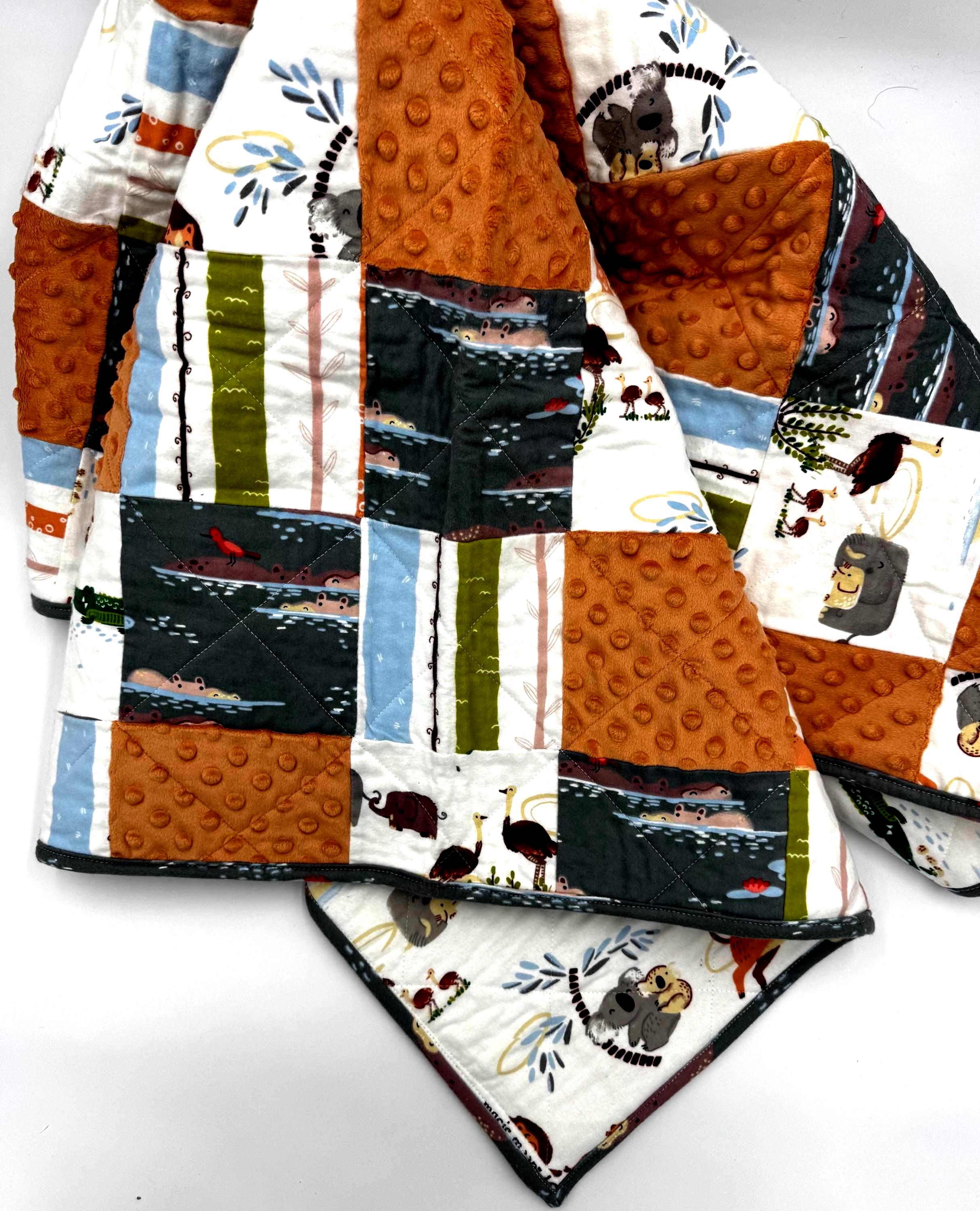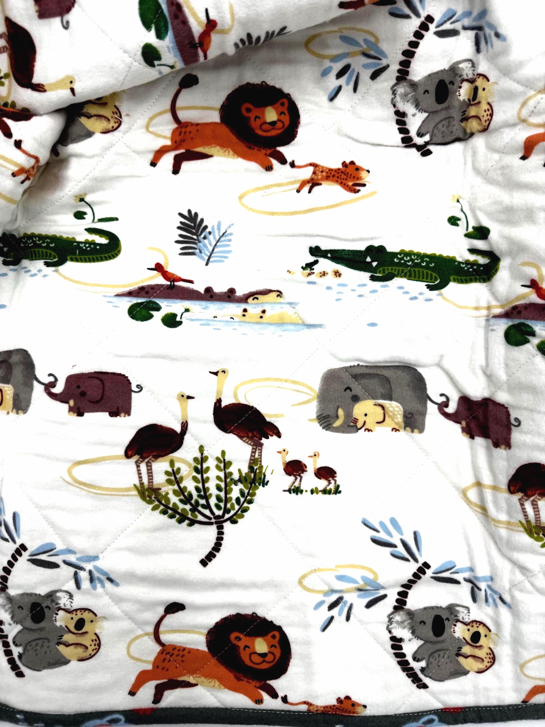 This whole cloth quilt features Safari Animal print on the front and back. Perfect for a baby boy or girl, this gender-neutral blanket will complement your nursery.
