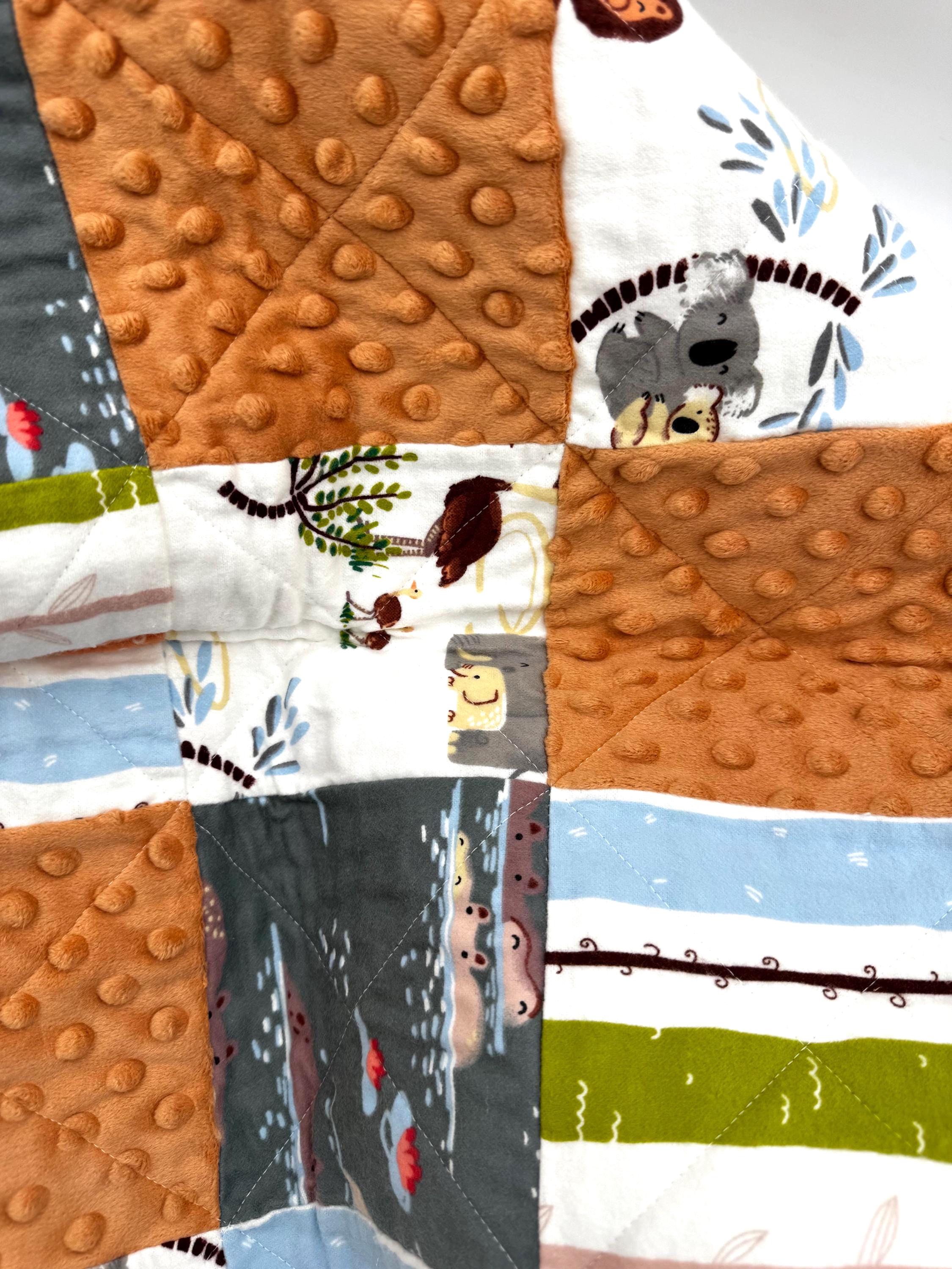 The quilt measures approximately 45" by 54" and is the perfect size for a playmat during tummy time, snuggling in the nursery, or in a crib as your child gets older. Handmade and one-of-a-kind.