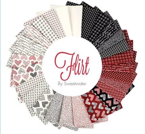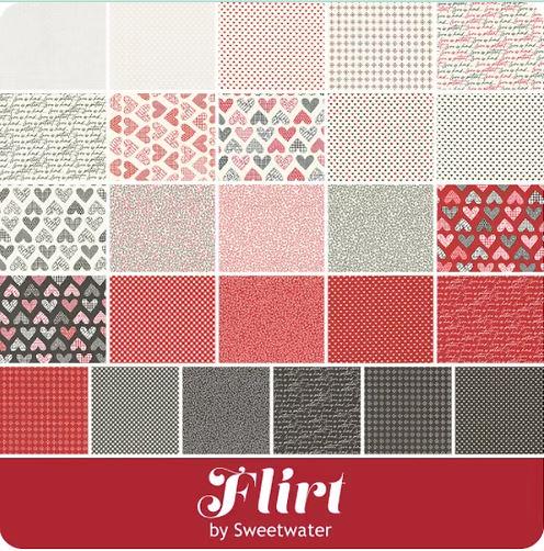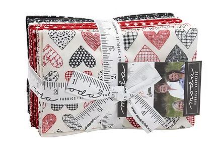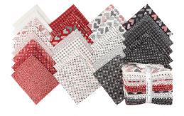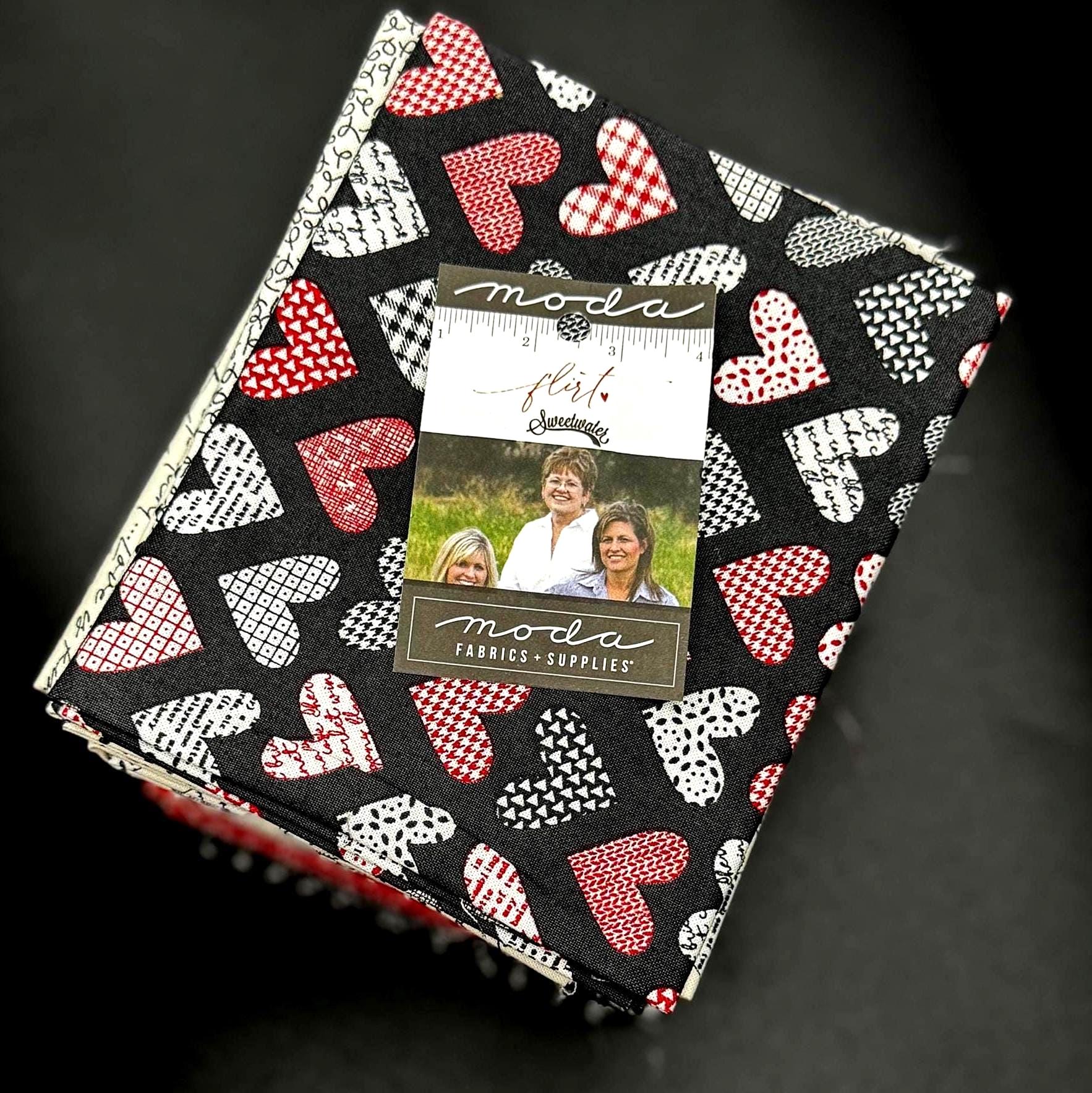 Red, white, and black fat quarters of Valentine's Day hearts, text, and more. It's not Cupid's arrow making you blush, it's the darling little hearts of the Flirt collection! By Sweetwater for Moda Fabrics, Flirt is the perfect Valentine's Day project collection, it features intricate text, hearts, gingham, and more on signature Valentine's colors.