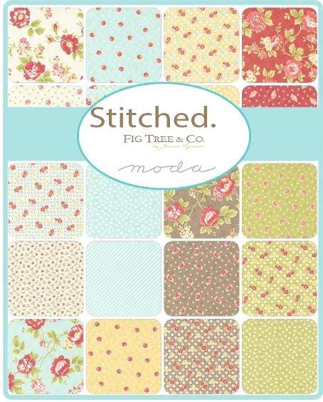 Stitched is inspired by a few of Fig Trees favorite vintage prints. It has pinked edges, tiny traditional stars,and stitch lines with Classic Fig Tree colors in soft muted tones of warm reds and aquas mixed with golden yellow, soft greens and taupes.